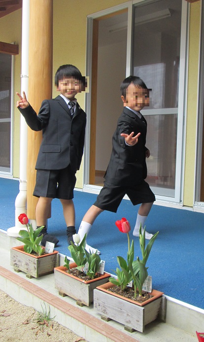 卒園前に植えたチューリップの前で記念撮影。