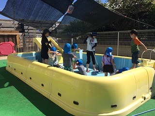 毎年ながら、プール最終日は自分たちができるようになった事を皆に見てもらいます。1歳児も見守る中2~5歳児のみんながそれぞれ最後のプールを楽しみました。