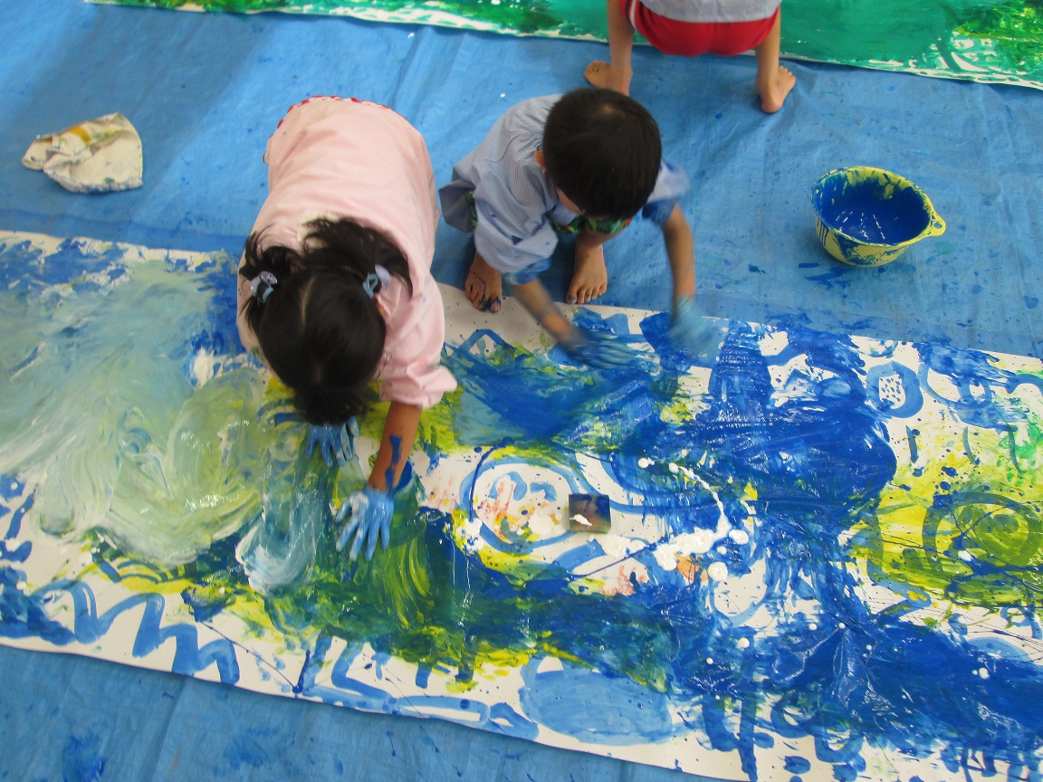 この法被は、草津地域のおばあちゃんから生地をいただきました。子どもたちのなつまつりに使うならどうぞ・・・と。そしてその生地を職員がコツコツと縫い今年も3~5歳児全員が法被をきることができました。おばあちゃん本当にありがとうございました。