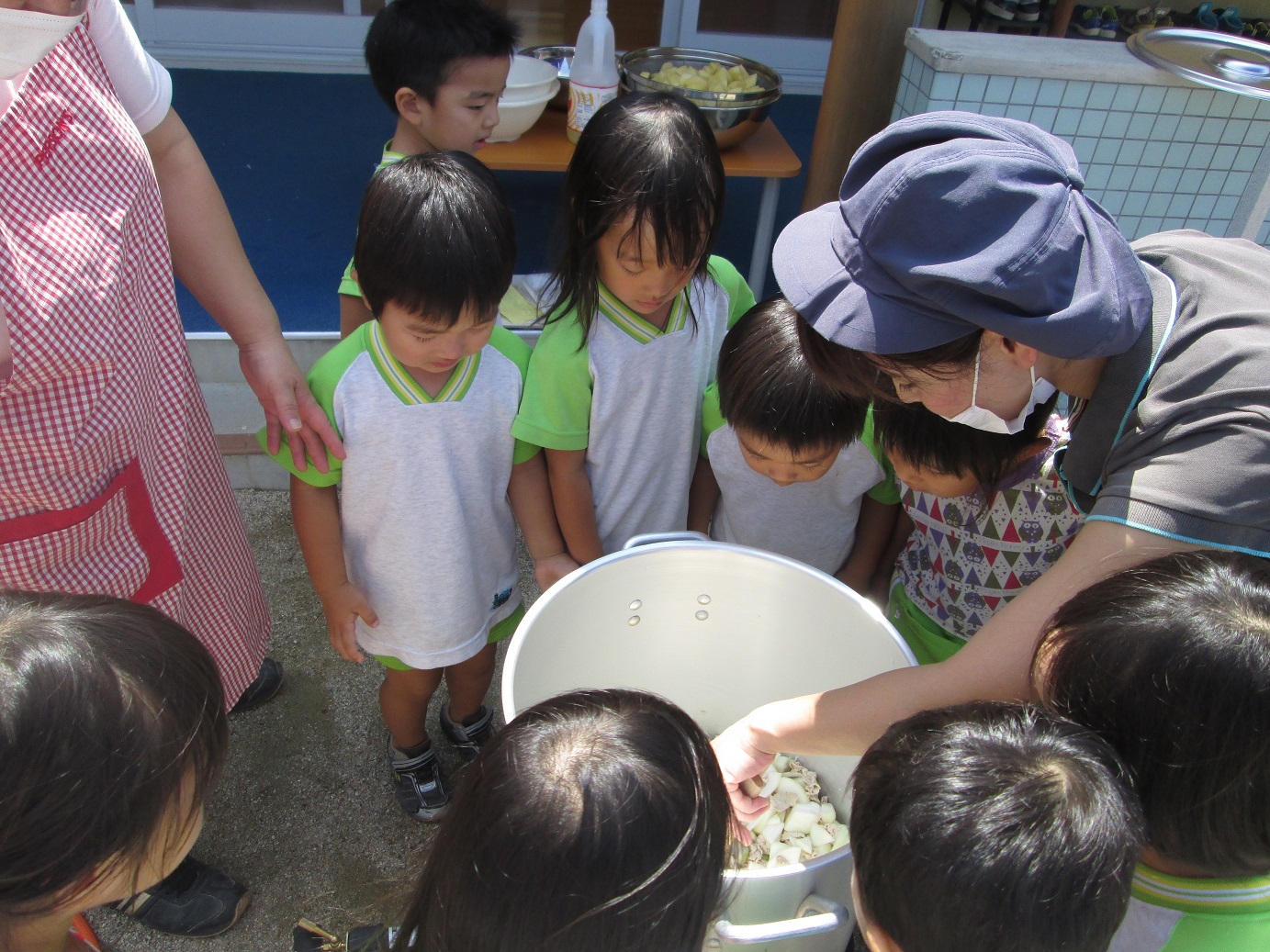 切れた野菜を順に入れて園庭で炒めます。「これはぼくが切ったやつや!」