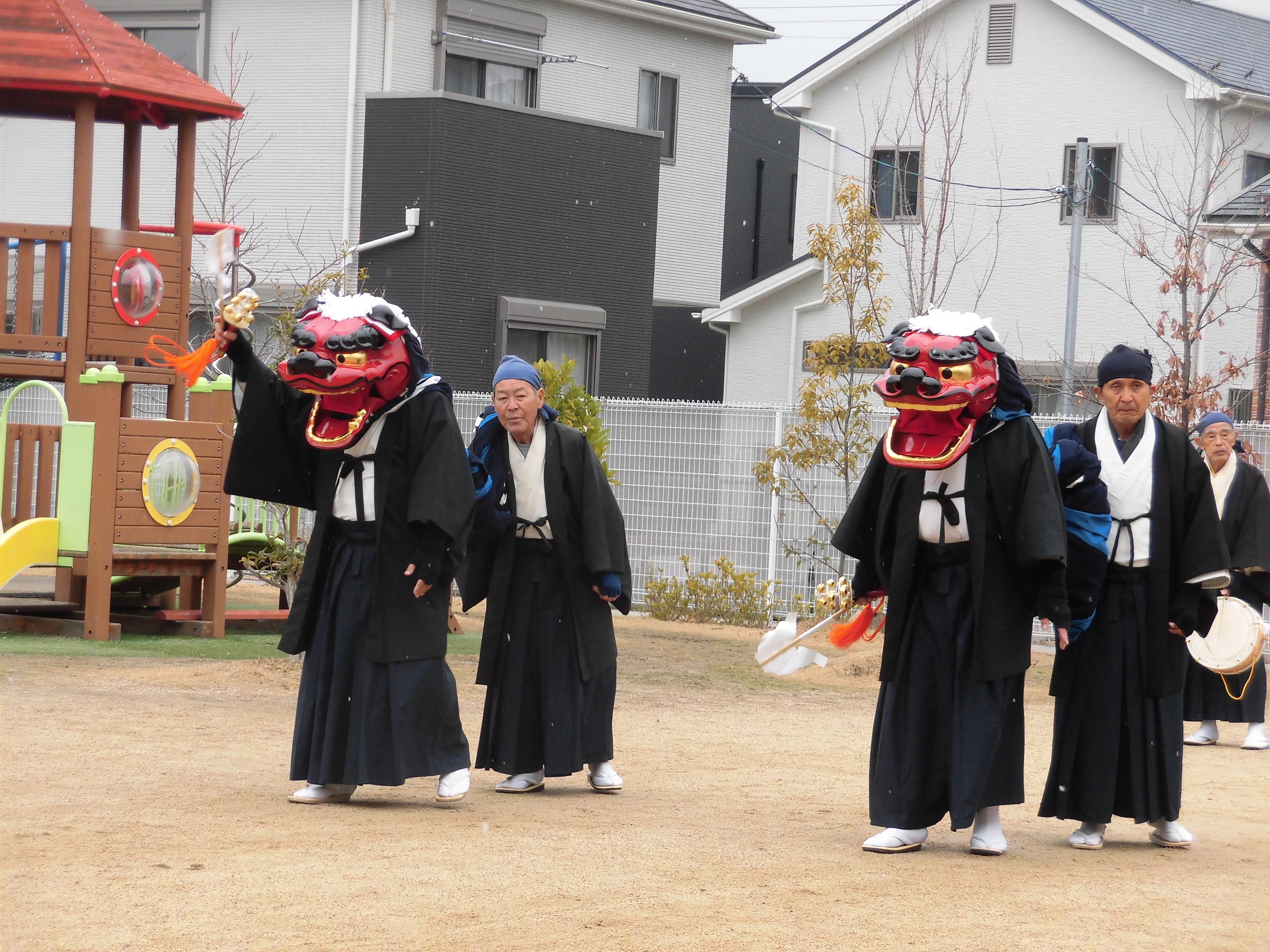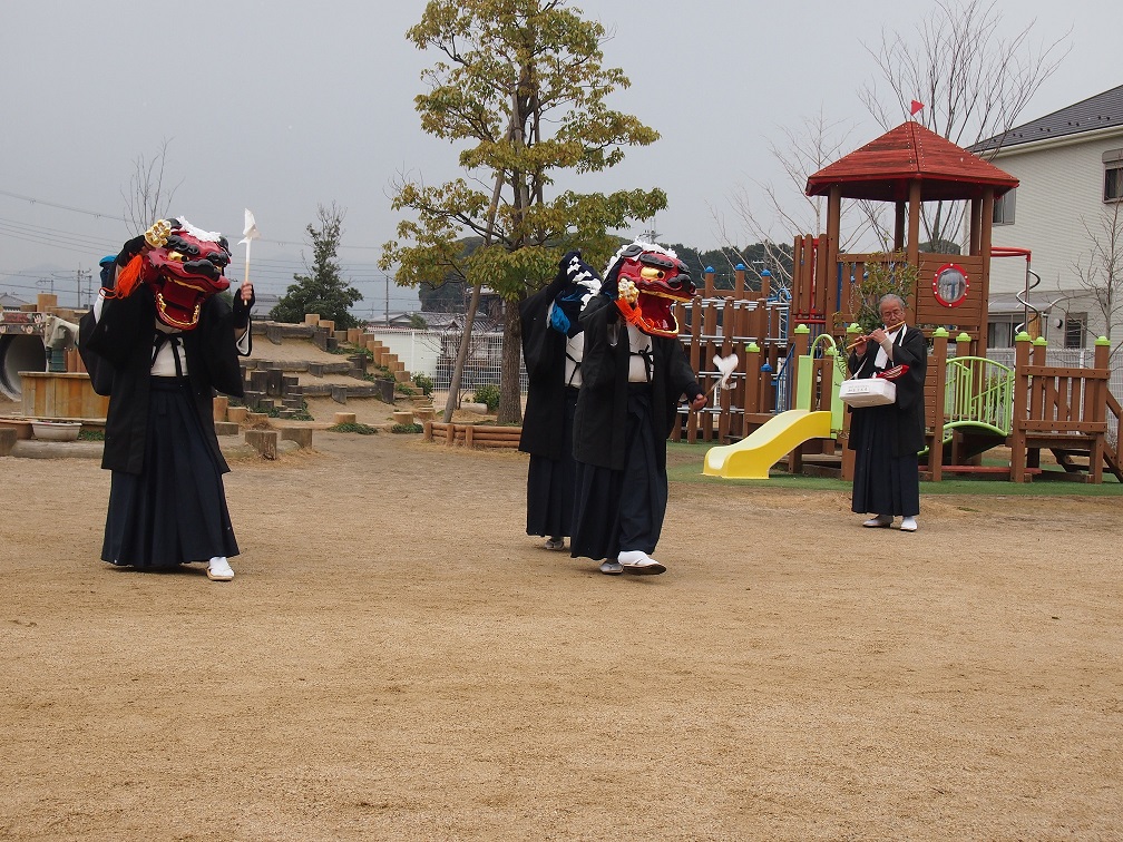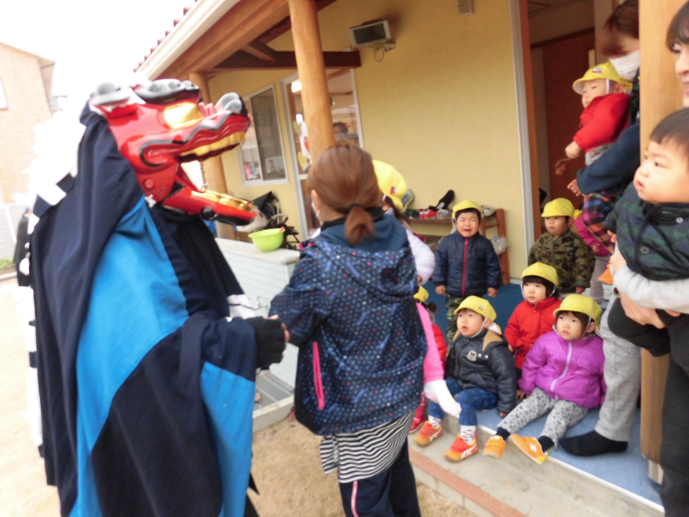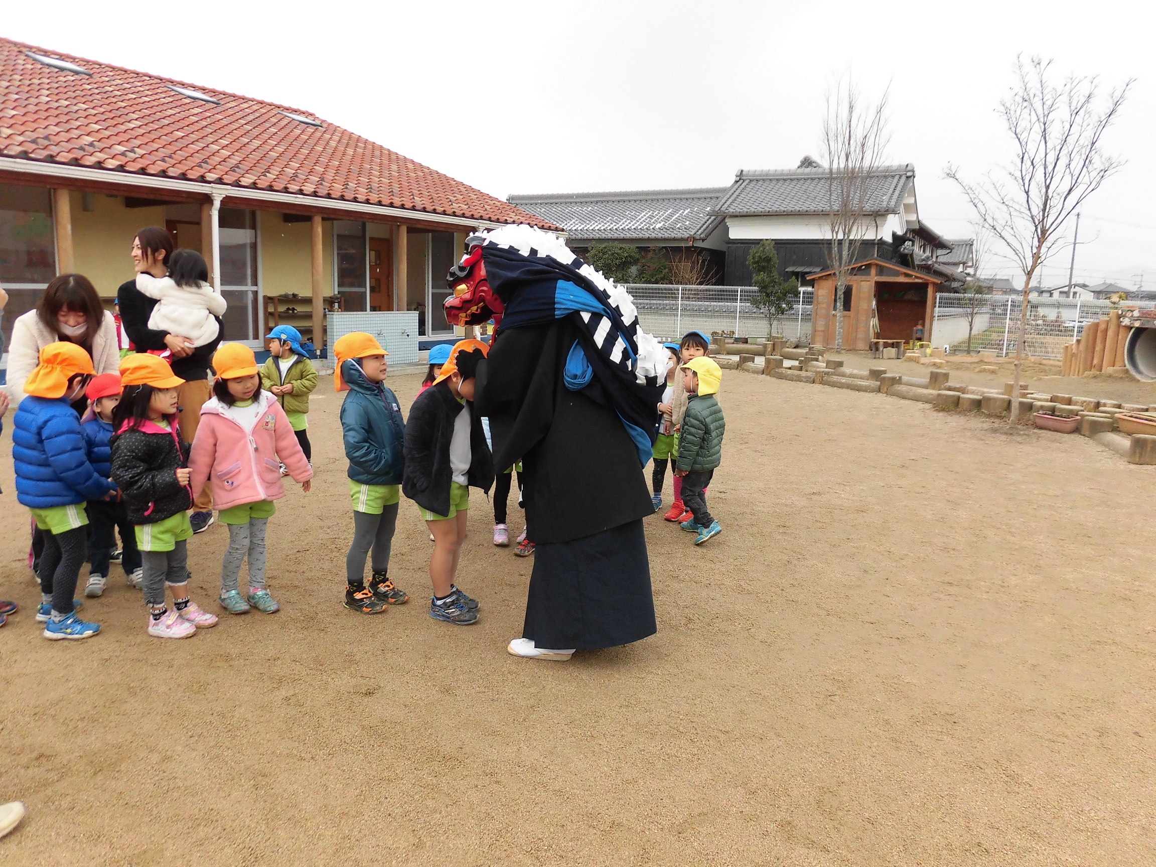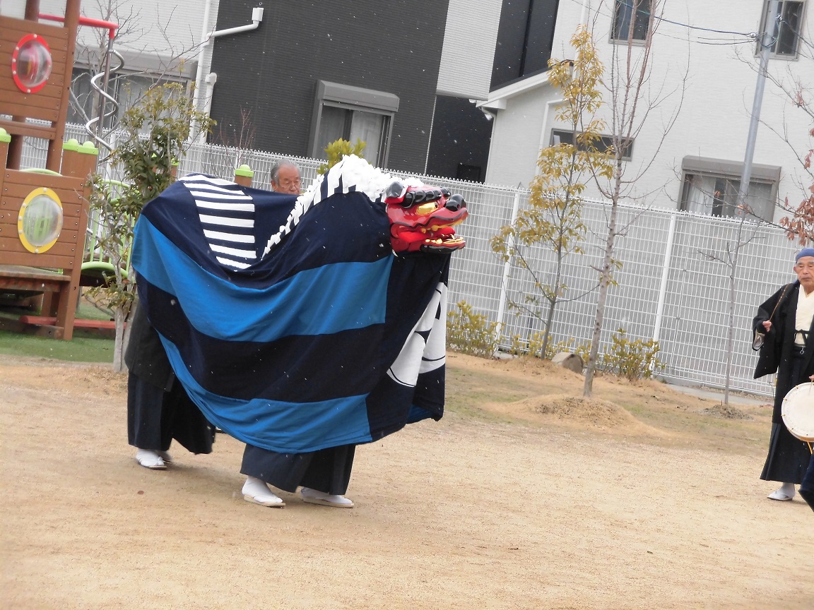 毎年園に来てくれる獅子舞。子どもが頭を噛んでもらうと厄除け効果が強くなるといわれています。今日は、雪がぱらぱらと舞う中で獅子舞の舞は風情はあるものでした。