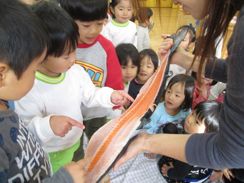でも、切り身になった鮭つかってを園庭でチャンチャン焼き!!次第にその匂いに「おいしそう!」と声があがります。