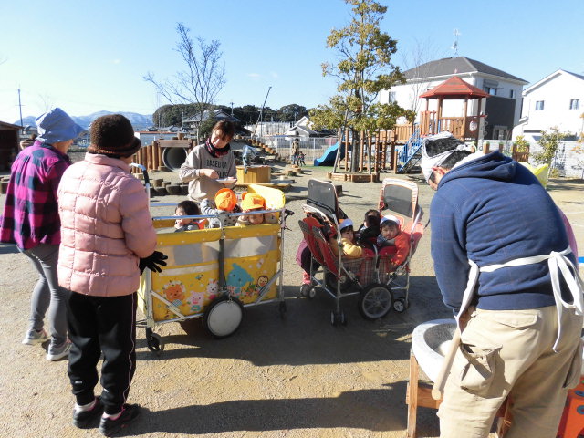 今日は昨年に引き続き、矢橋の子育てサロンの親子の方々も参加してくださり、一層園庭には楽しい声が響いていました。風の強い寒い日でしたが、人と人が集うということは、とても心が温まりますね。