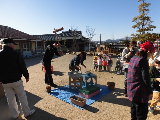今日は楽しみにしていた餅つきの日でした。園庭にコンロや臼の準備がはじまると、いつもとは違った雰囲気に子どもたちもソワソワ!保護者の方や地域の方も手伝いにきて下さり、朝から園庭はとってもにぎやかでした。