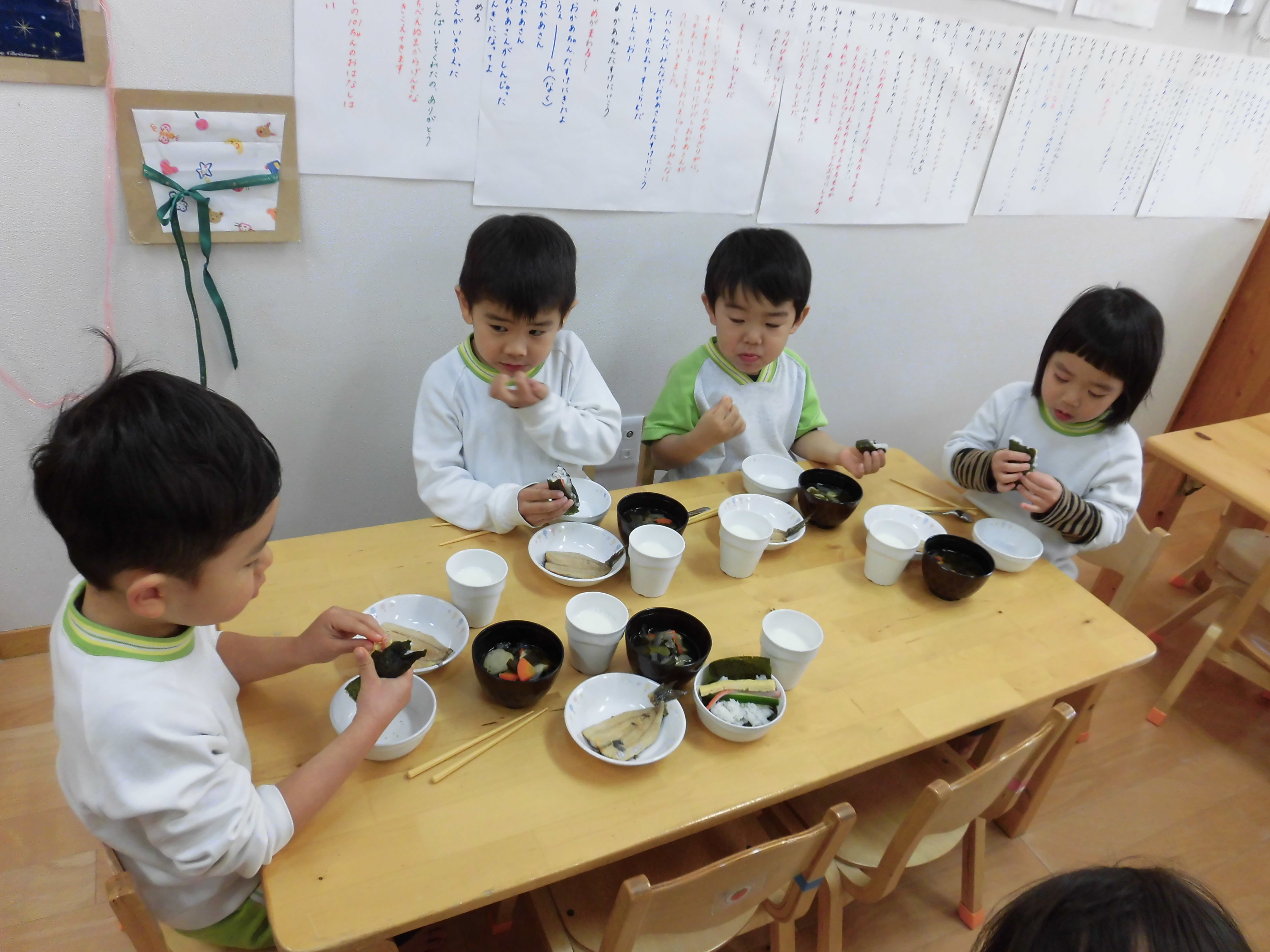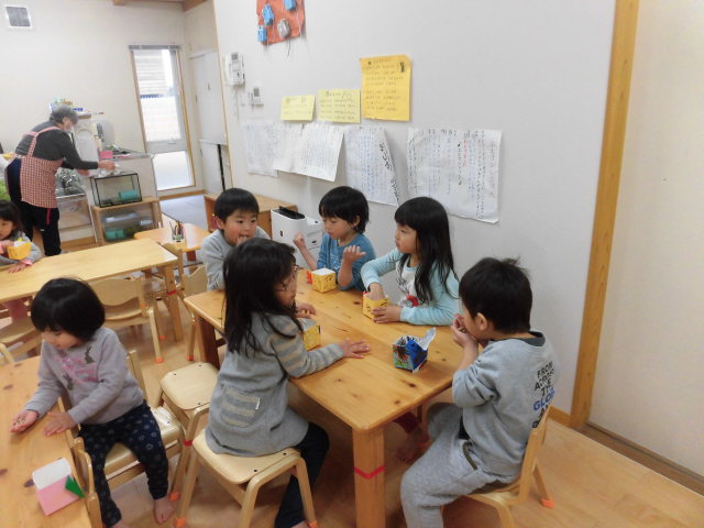 お部屋に戻ってからは、年の数プラス1つ豆を食べて、みんなの心の中にいる「いやいや鬼」や「泣き虫鬼」「おこりんぼ鬼」をやっつけました。