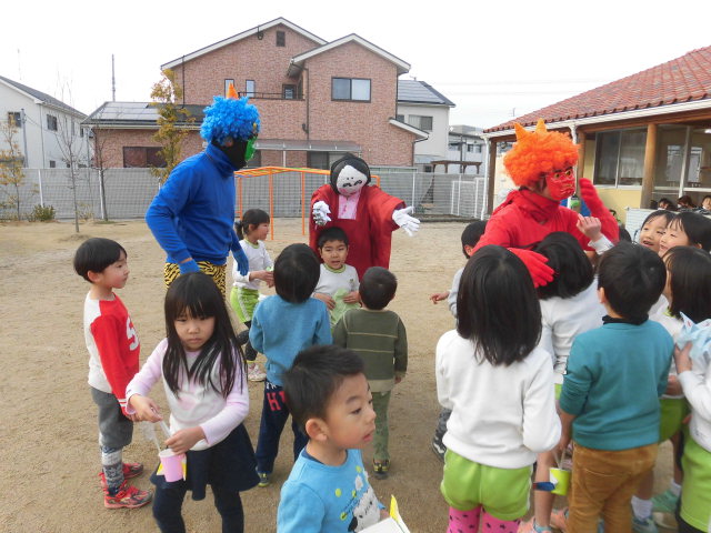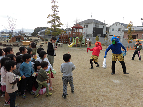 園庭にやってきた鬼さんに「おにはそと~ふくはうち!!」・・・と一生懸命豆を投げる前に全速力でみんな逃げる逃げる!中には鬼さんにつかまってしまう子もいましたが、お友だちが豆を投げてくれて助けてもらったり、「悪いことしません」とお約束して無事に離してもらいました。