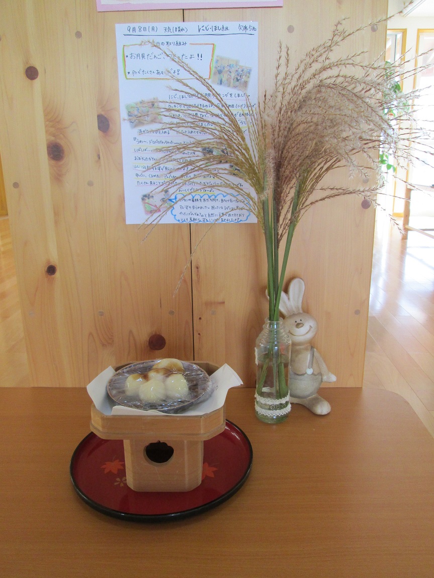 子どもたちの中でも何度かおだんご作りを経験していることもあり、水加減と丸める量考えながら5歳児いちょうぐみの子どもたちを中心に作ります。「これはおおきいなあ」「ねえ!このぐらい?」と友だち同士確認しながら作るお団子。できあがったお団子は、すすきを眺めながらいただきました。