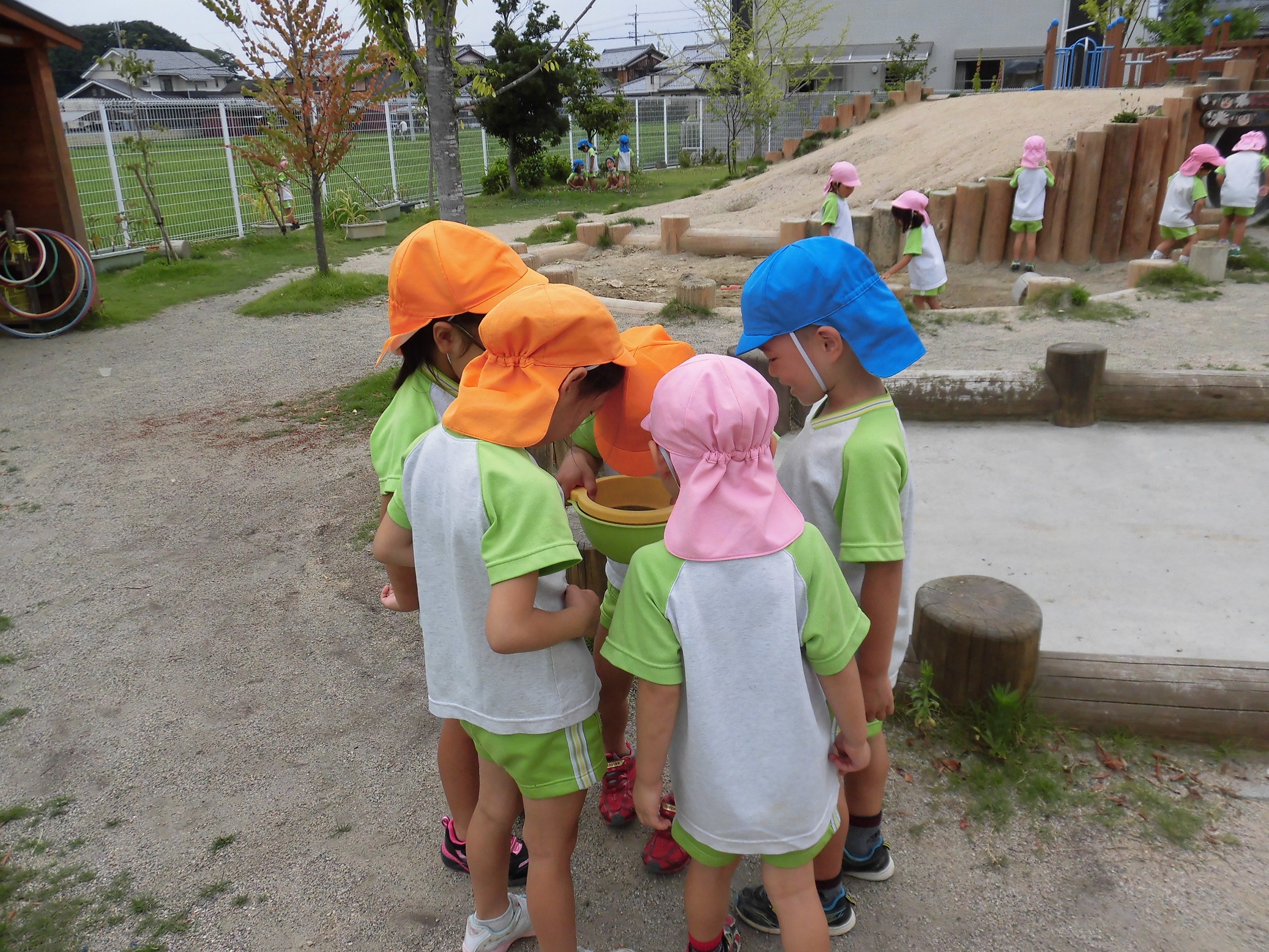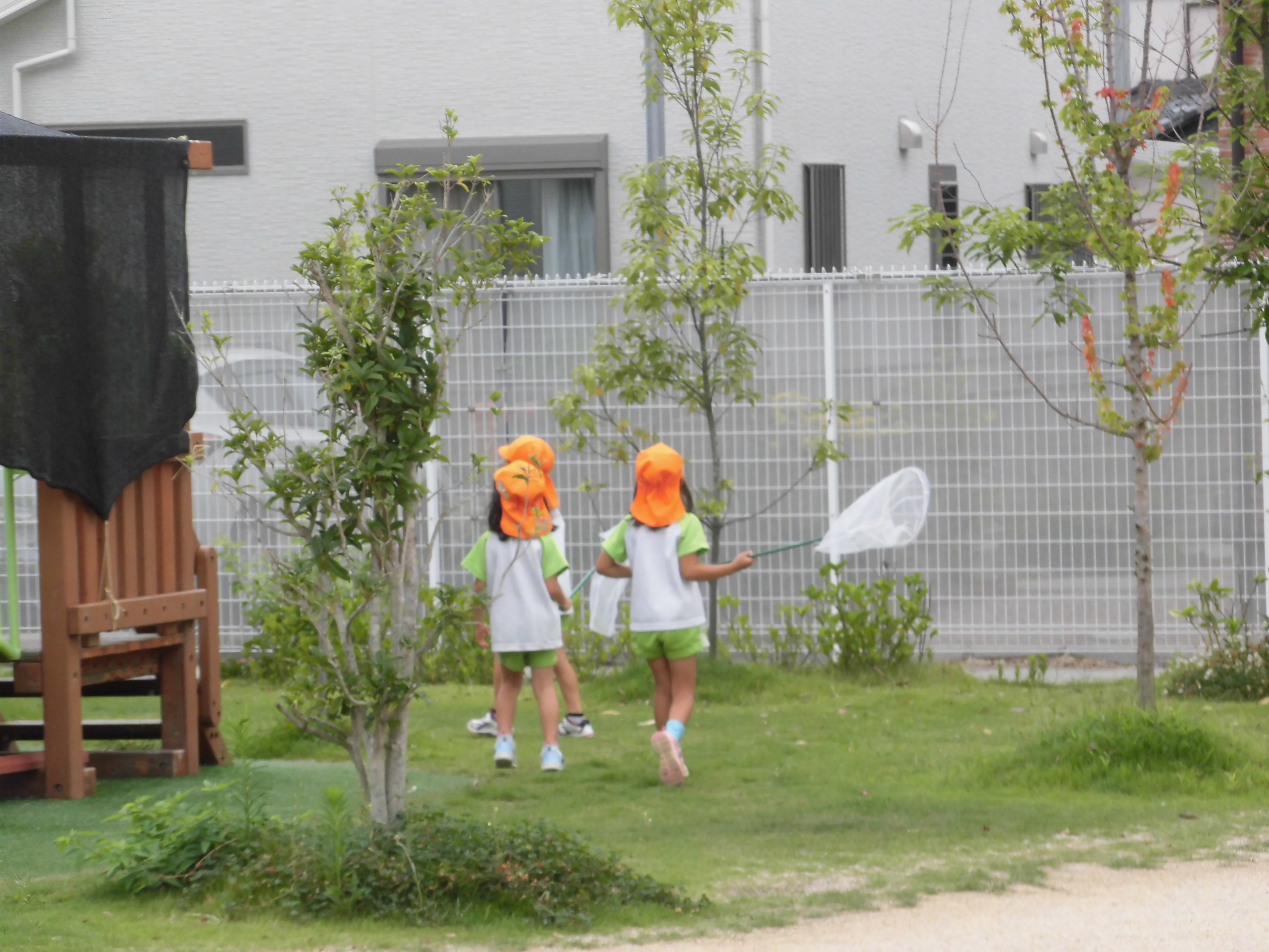 子どもたちは虫網をもって園庭に集まります。