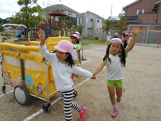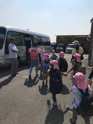 4歳児どんぐりぐみの子どもたちや先生のお見送りをうけ、『頑張ってくるわ~』と余裕の声。