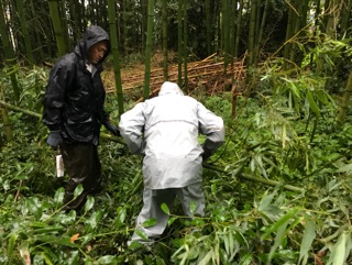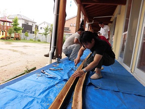 大雨の中、「子どもたちのために!」取ってきていただいた貴重な竹。雨の降る園庭で竹をふたつに割り、ひとつひとつ節をはずしていきます。子どもたちもそんな大人たちの姿に「今日流しそうめんできるんや!」と目をキラキラさせて喜んでくれていました。