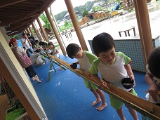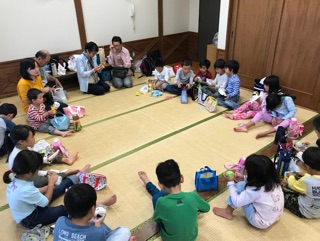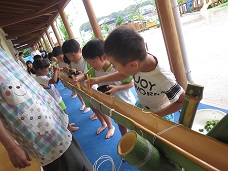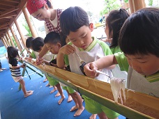 流しそうめんをするころには少し雨もあがり、子どもたちの元気な声が園庭に響いていました。今回の大雨で被災された方々にも、早く安心して笑顔で過ごせる日が戻ってきますように・・・と願うばかりです。当たり前の日常を過ごしていけることに感謝し、来年もまたこんなふうにみんなでワイワイと言いながら、流しそうめんができるといいなと思うのでした。