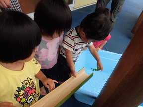 そしていよいよ3.4.5歳児の登場です。フォークやお箸を使って取る姿は真剣そのもの。園の畑で作ったトマトやきゅうりも流れてきて大喜び!「とれた!」「あ~!いっちゃった・・」と大騒ぎのひとときでした。