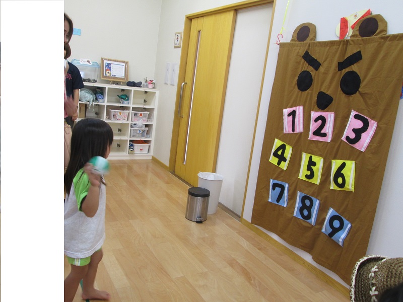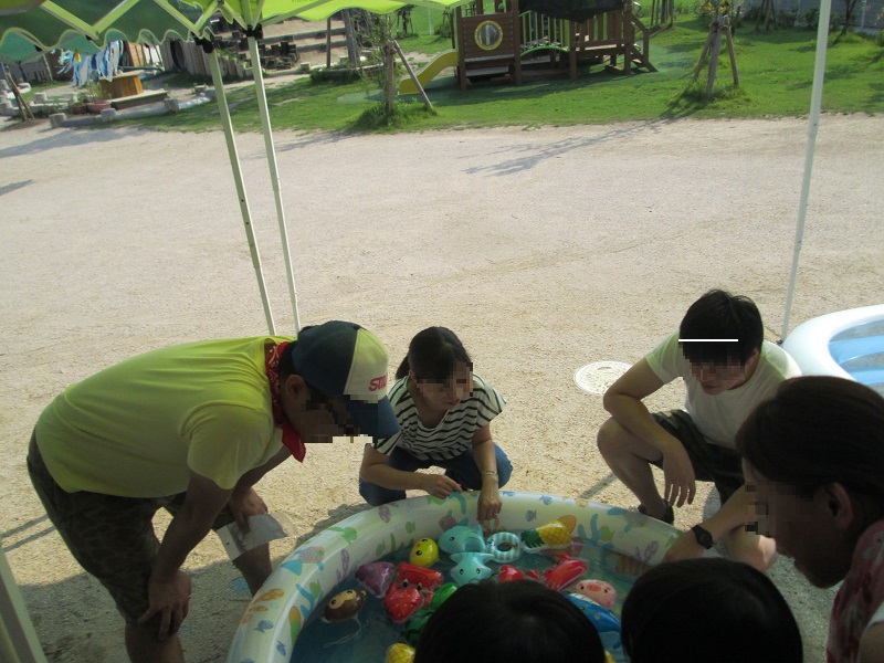 模擬店では、カキ氷やおもちゃすくい、先生の手作りのくまの的当て等楽しみました。