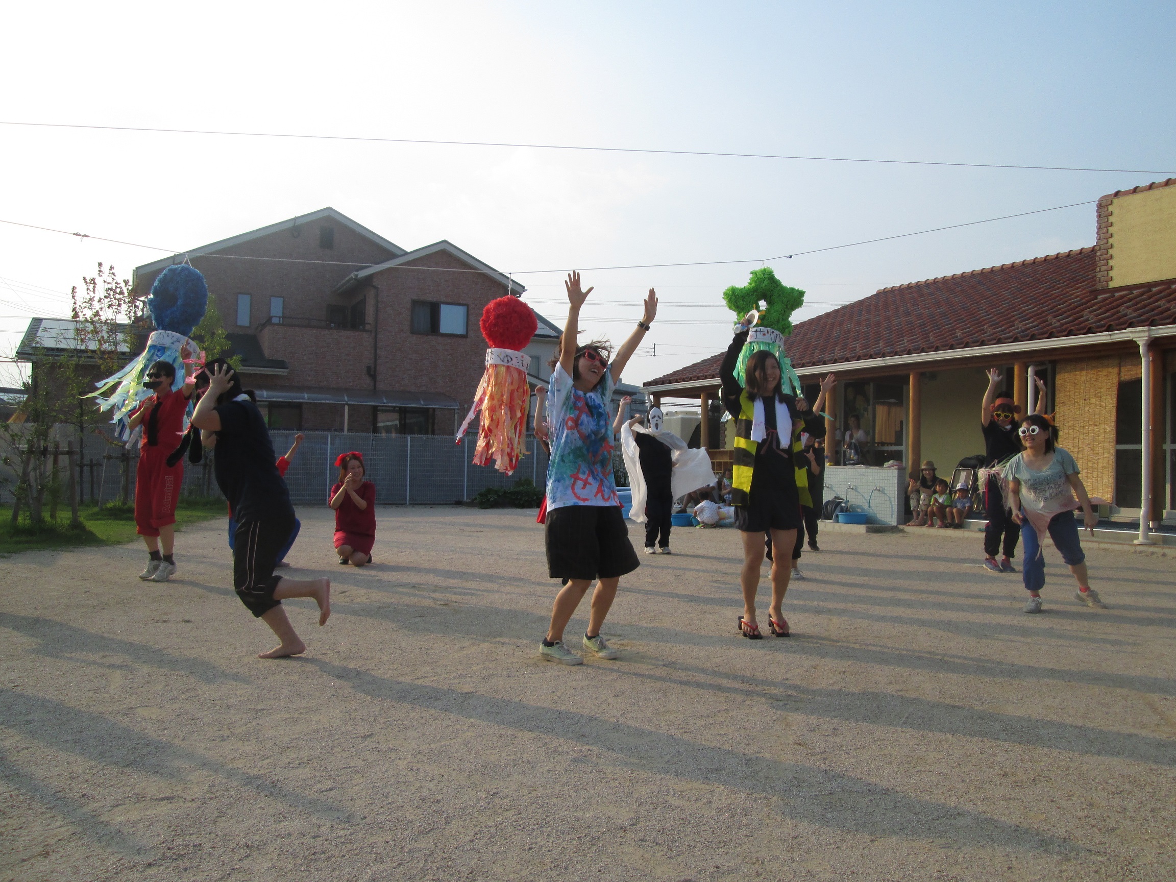 この法被は、草津地域のおばあちゃんから生地をいただきました。子どもたちのなつまつりに使うならどうぞ・・・と。そしてその生地を職員がコツコツと縫い今年も3~5歳児全員が法被をきることができました。おばあちゃん本当にありがとうございました。