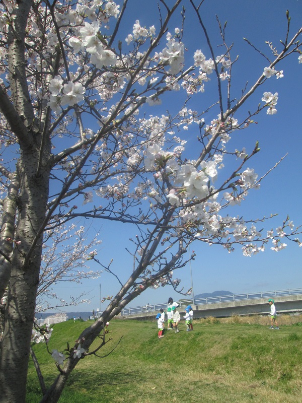 乳児クラスは保育園の近くの鞭崎神社、幼児クラスは草津川沿いの土手。どちらも桜満開です。