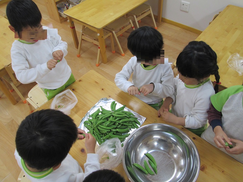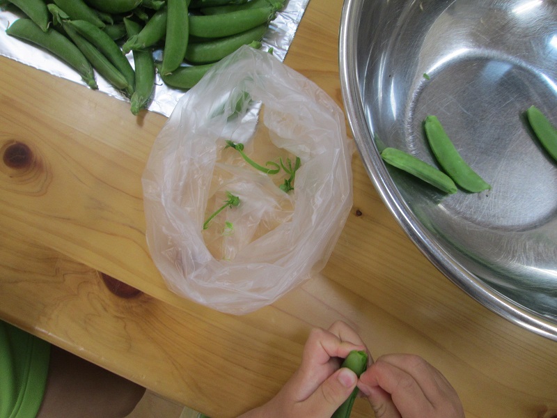 さて、この筋取り。なかなか上手くできないようで悪戦苦闘。ひっぱってもダメ!ねじってもだめ! うまく手先を使ってやっとコツを見つけだしたみんなは筋をちゃんと取ってくれました。