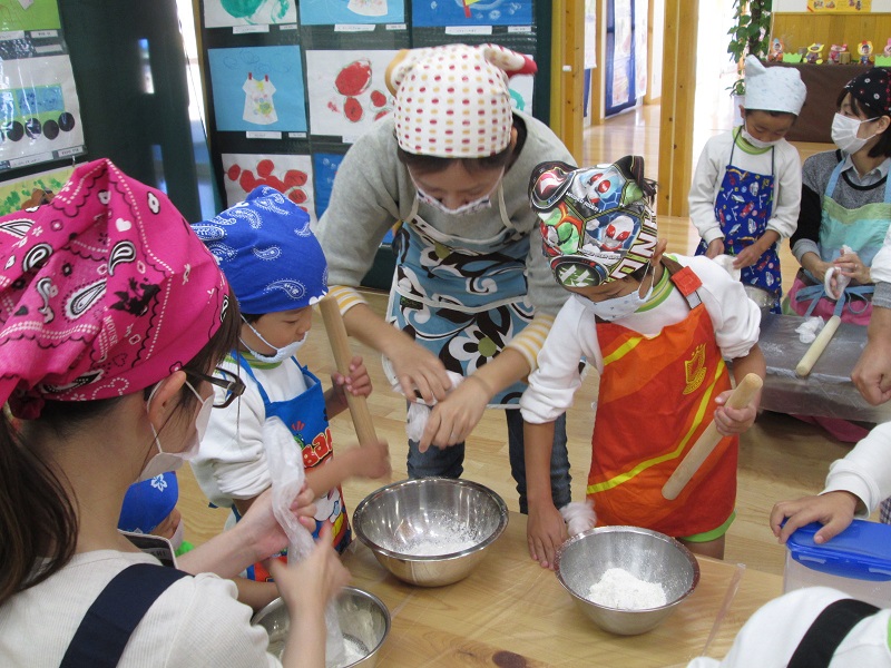 その後、子どもたちも楽しみにしていた親子でのうどん作りと保育園で収獲したさつまいも焼き。