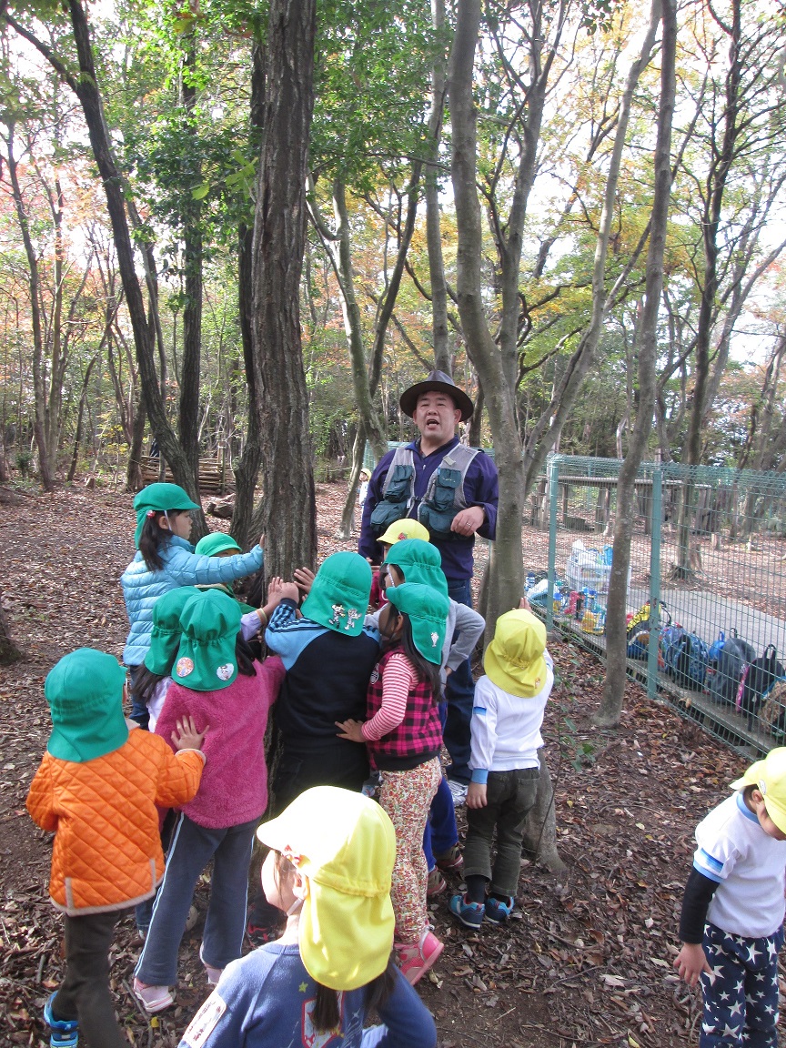 4歳児はさくら坂保育園の裏山体験。しまっち先生と一緒に身体いっぱい自然を感じながらあそびました。 自然はたくさんの気づきがあります。「木には実はあったかい・冷たい木があるんだよ」としまっち先生に教えてもらいました。