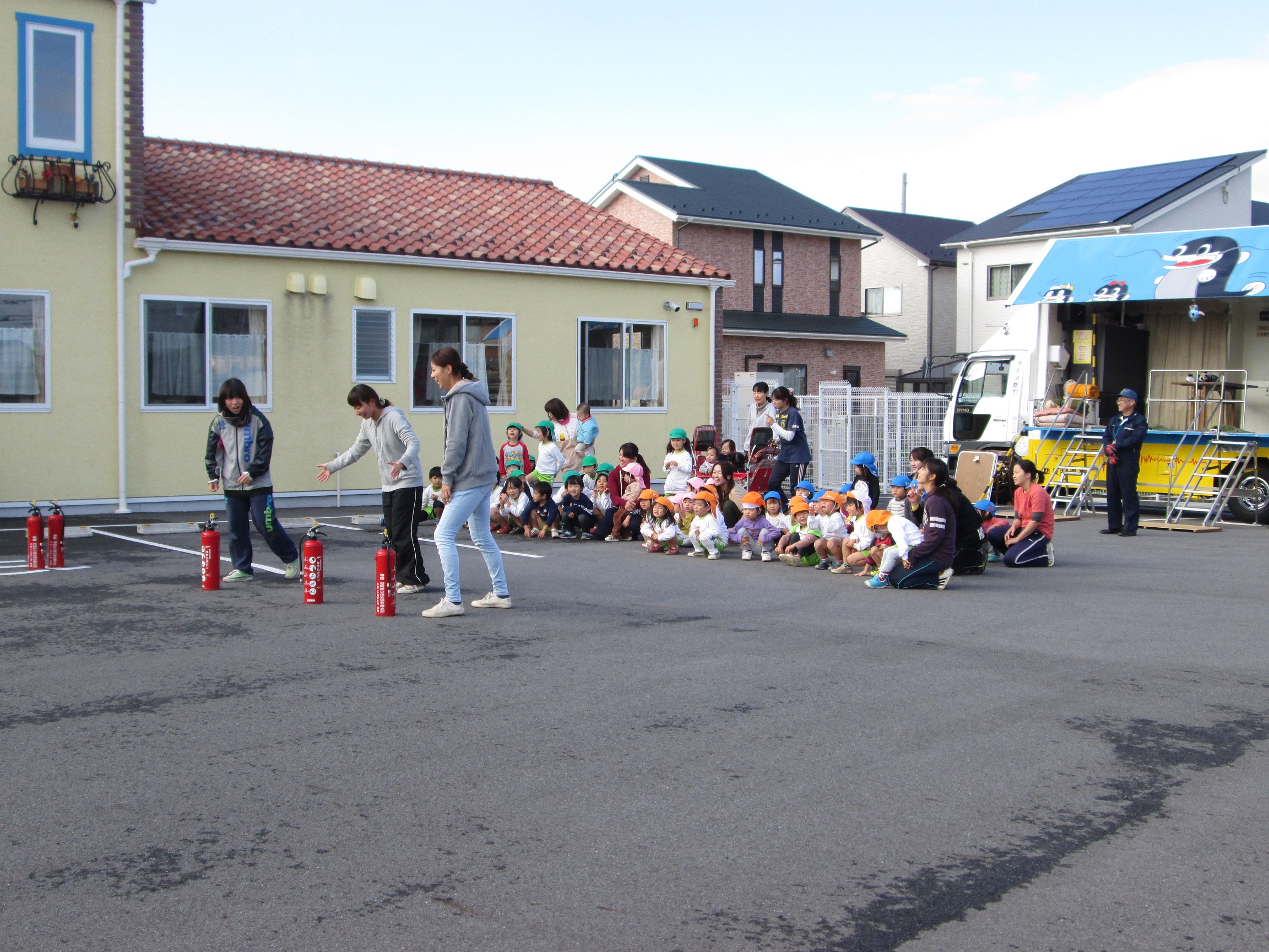次は、保育士の消化訓練。「火事だ~!!」みんな助けるからね!!の声。そして後ろからは応援の声も響きました!!