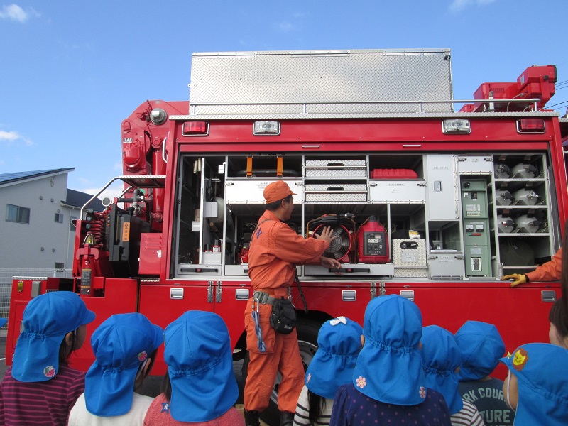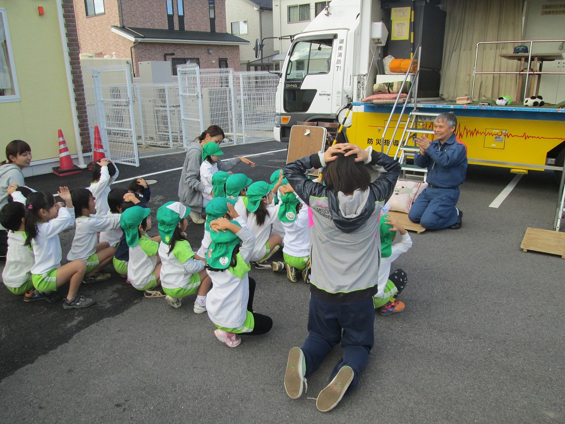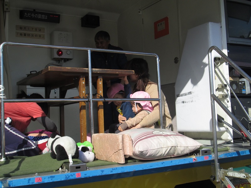 消防訓練の後は、起震車「グラドン号」の体験と救護車を見せてもらいました。子どもたちは、実際に地震の揺れを体感したり、地震の際に頭を守ることを教えてもらいました
