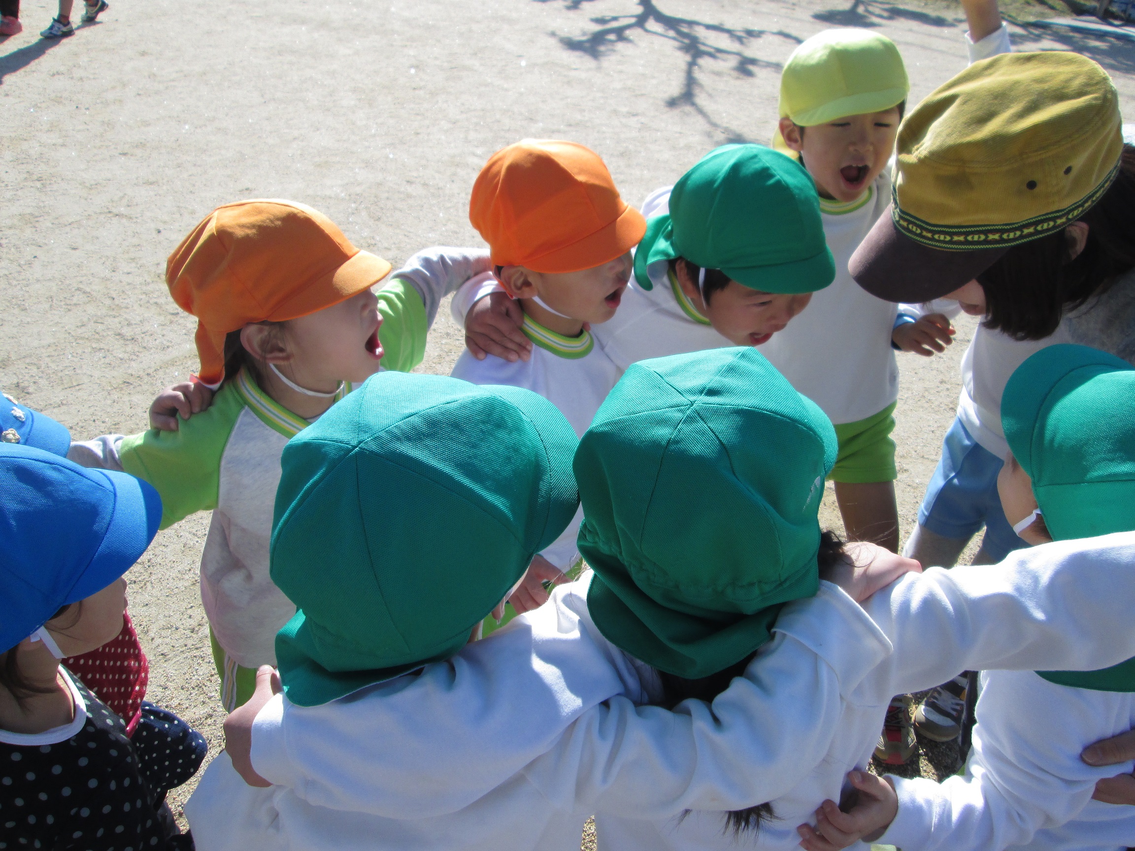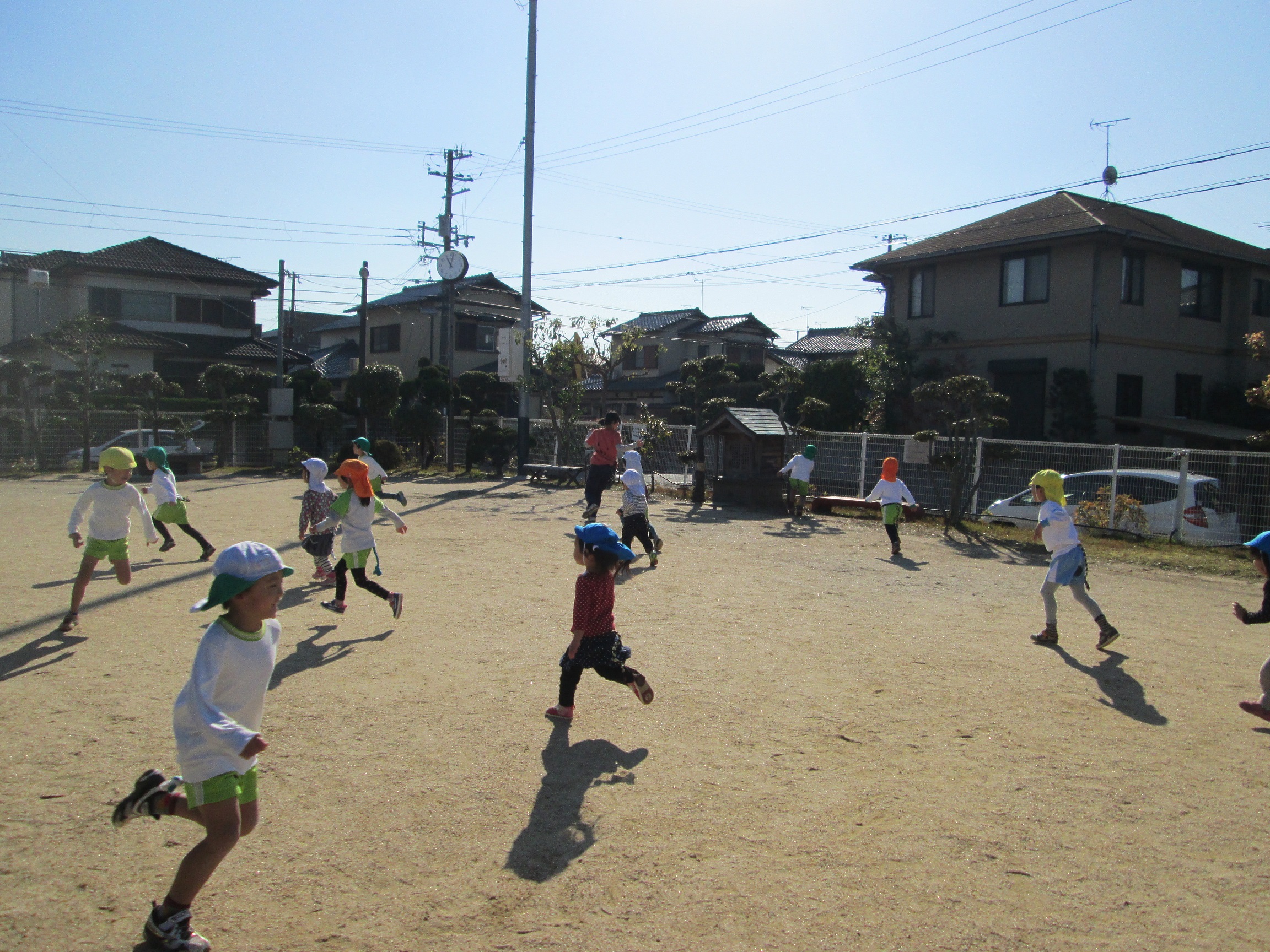 2歳児やまももぐみさんを気遣う????…いえ、そんなことはありません。上着を脱ぎ捨て勿論一人ひとりが思いっきり勝負です!!