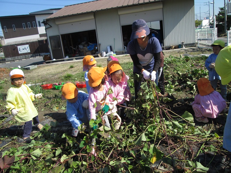 4歳児は、土の中のお芋を見つけると我先に!!と掘って掘って・・・気づけば、どろんこになりました。土の中からは幼虫やミミズがたくさんでてくると、一層目がキラリ。「つかまえた~」「ぼくもさわってみる!!」