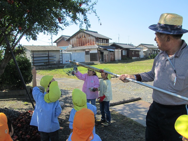 畑の周りには、たくさんの野菜を育ててらっしゃいます。今日は柿・キウイ・ざくろ たくさん収穫させていただきました。木に手を伸ばし、「とどいた!!」・・・・「せんせい~はやくたべたい・・」