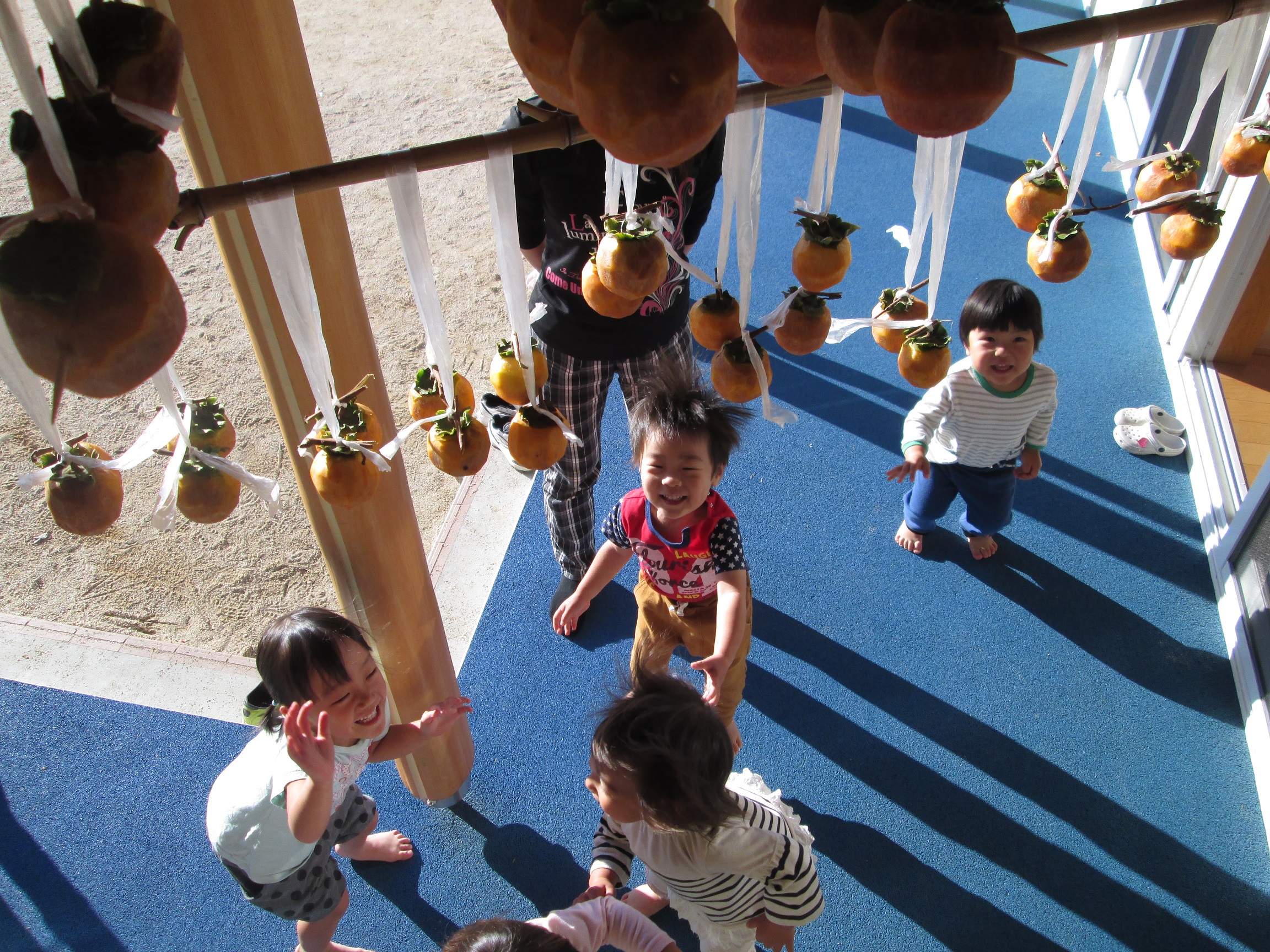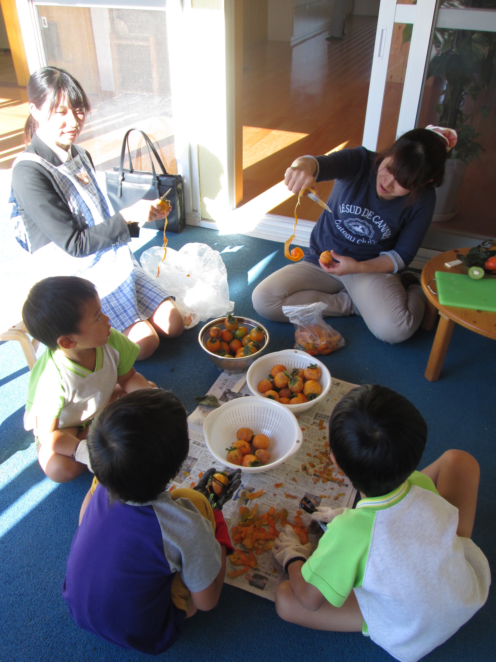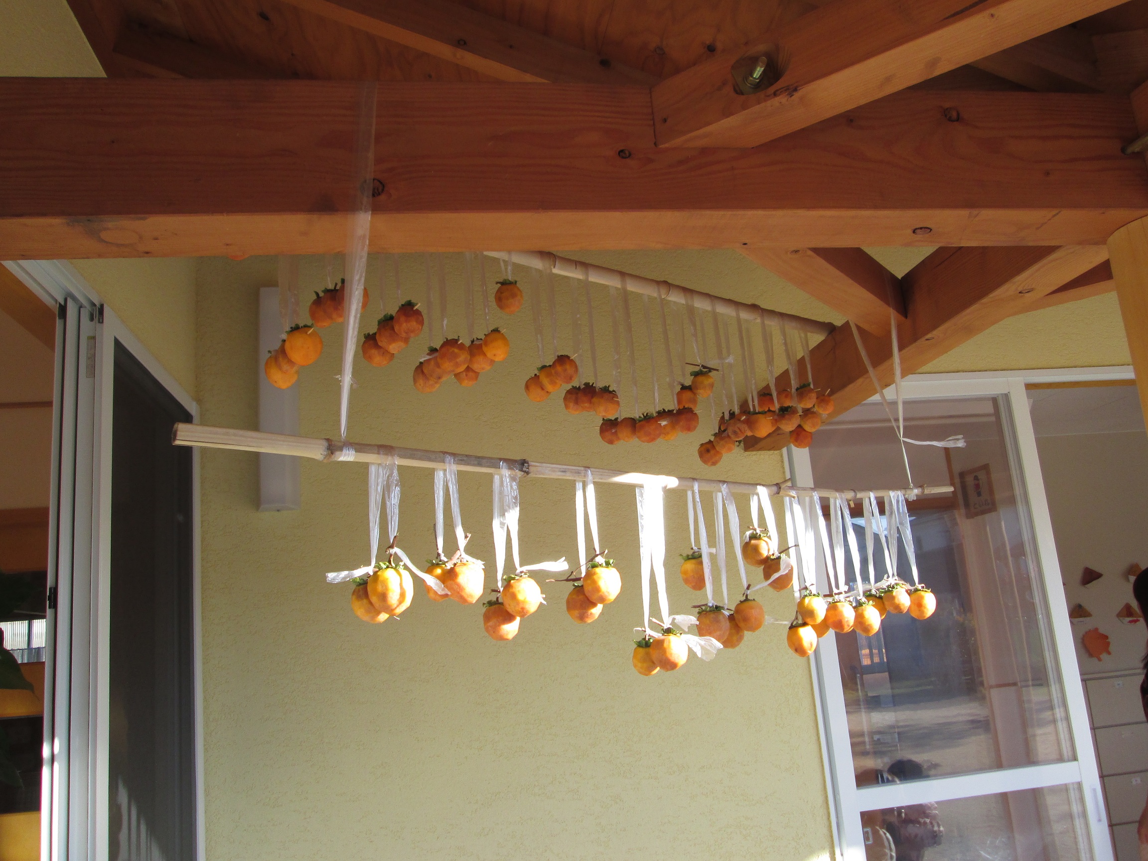 この渋い柿を食べるには・・・相談の結果、干し柿をつくることになりました。皮を一つひとつ子どもたちと一緒に剥いて紐でくくり吊るしました。