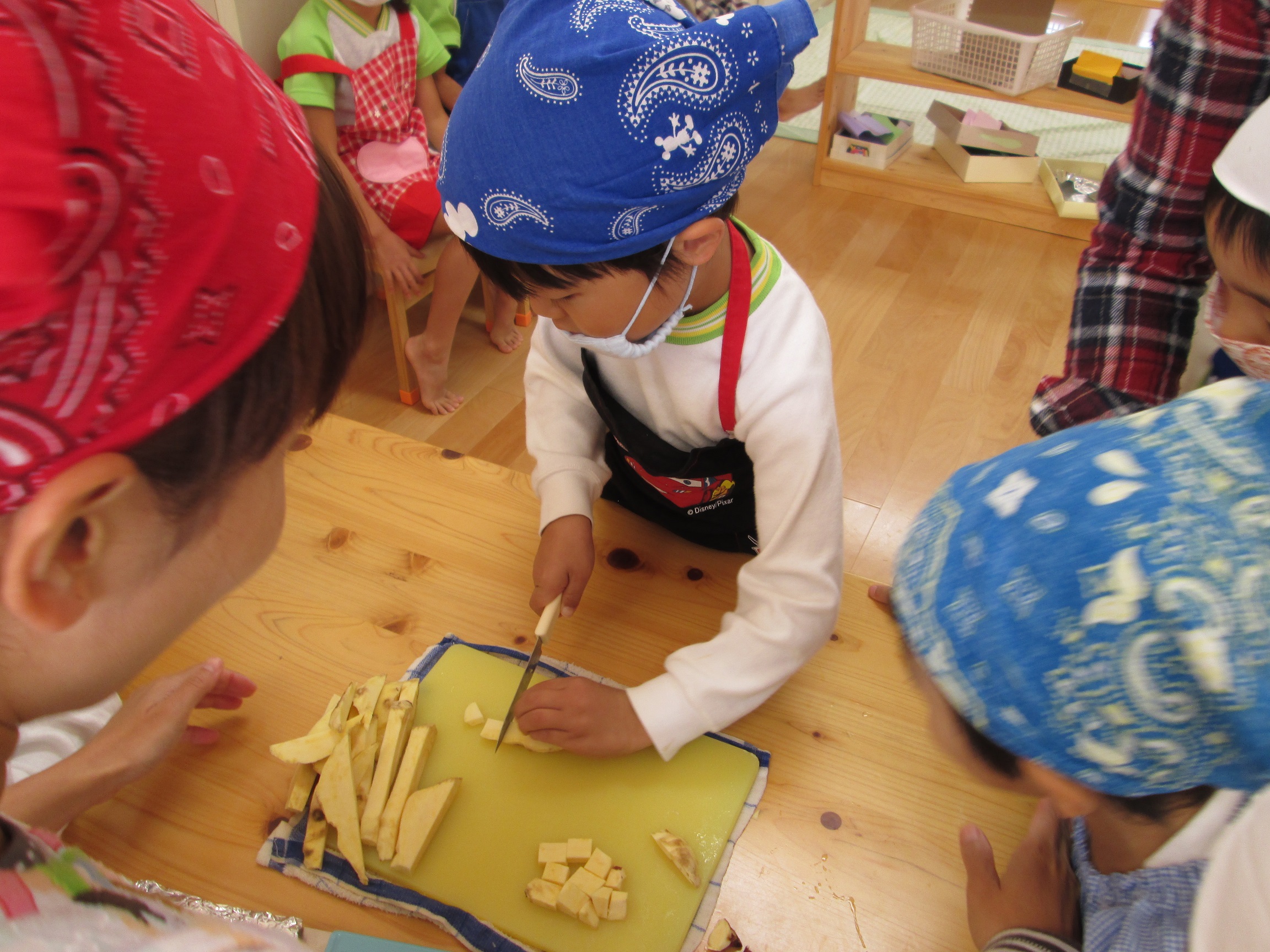 5歳児いちょうぐみは包丁でさつまいも切り。