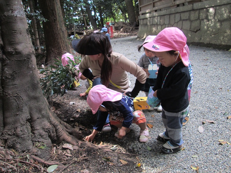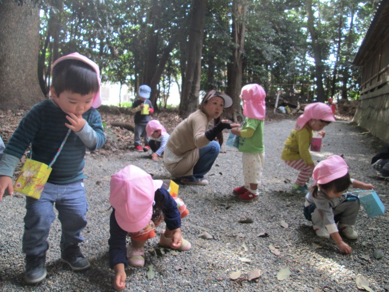 神社には自然もいっぱいです。自分たちで作ったカバンにひとつ・・ふたつ・・・小さな実やどんぐりを大事に入れます。たくさんいれると嬉しくて・・・何度もかばんの中を覗きます。