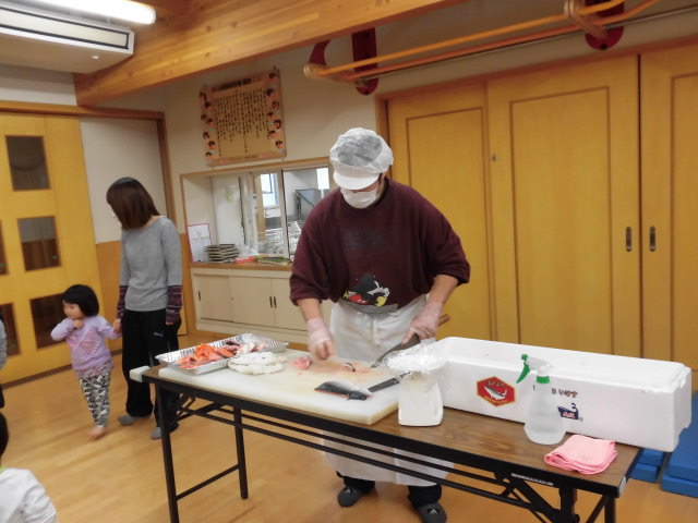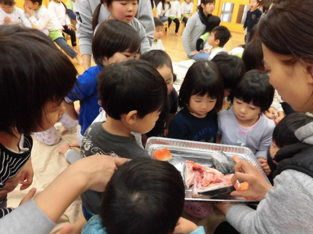ホールに集まるとみんな興味津々。大きかった一匹の鮭がさばかれて、どんどん小さくなっていく様子を見ながら「すごーい!」「ちっちゃくなってくー!」と大興奮です。骨を切る音やうろこをとる音に耳をすませ、魚の匂いを感じ、実際に触っていく中でいろんな、五感をめいいっぱい使って楽しんでいました。