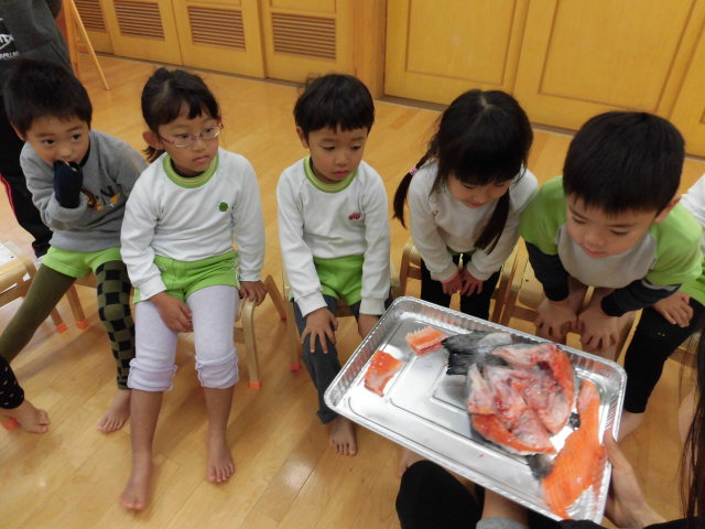 例年はこの後園庭でチャンチャン焼きをするのですが、今年は悪天候の為給食室でおいしく作ってもらいました。出来上がったのはおいしそうなチャンチャン焼きと鮭のあらを使ったあら汁!いつもよりとっても大きな声で「いただきます」のご挨拶をするとあちらこちらから「めっちゃおいしー!!」と嬉しい声があがりました。「いつものおつゆと味が違うー」と発見もあったようです。