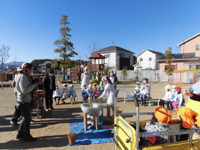 今日は楽しみにしていた餅つきの日でした。園庭にコンロや臼の準備がはじまると、いつもとは違った雰囲気に子どもたちもソワソワ!保護者の方や地域の方も手伝いにきて下さり、朝から園庭はとってもにぎやかでした。