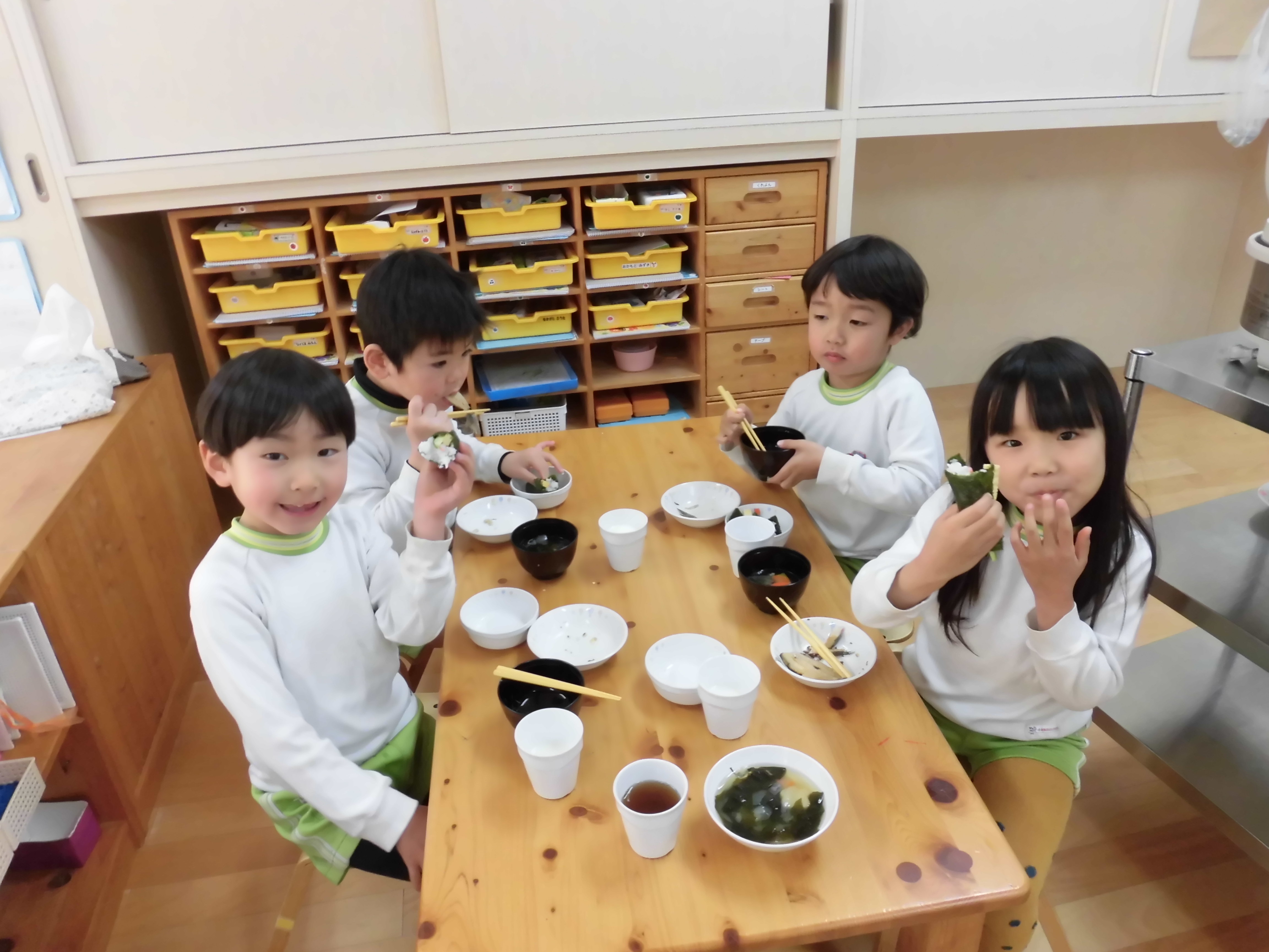 給食も恵方巻き!3~5歳児は自分たちでくるくる巻いて作りました。