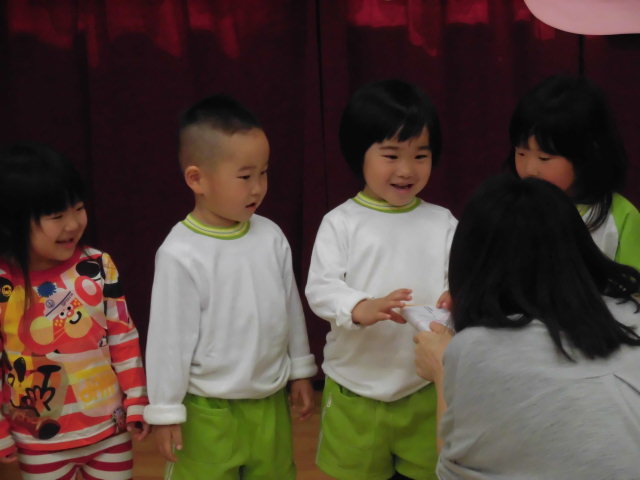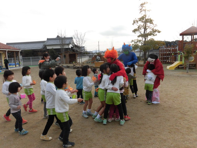 園庭にやってきた鬼さんに「おにはそと~ふくはうち!!」・・・と一生懸命豆を投げる前に全速力でみんな逃げる逃げる!中には鬼さんにつかまってしまう子もいましたが、お友だちが豆を投げてくれて助けてもらったり、「悪いことしません」とお約束して無事に離してもらいました。
