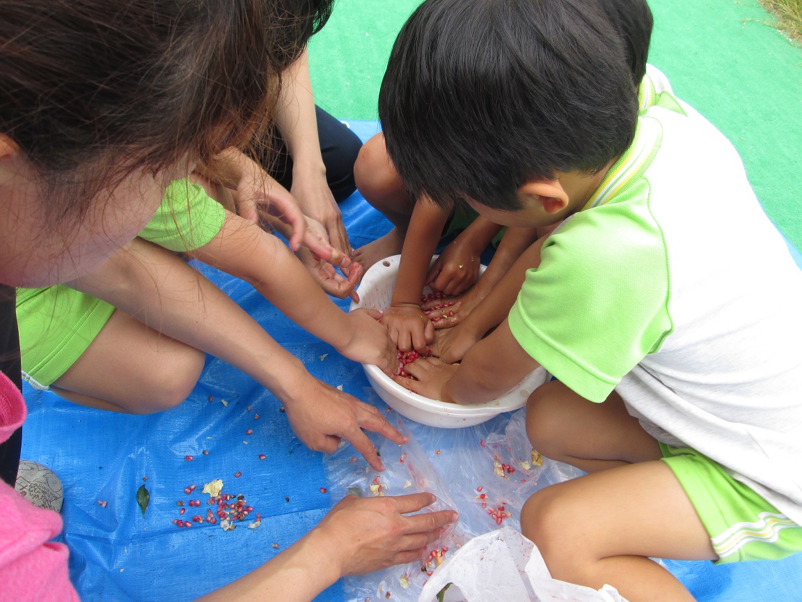 手に取ると・・・たくさんの実が詰まっていることに驚く子どもたち。そして押しつぶすと中からプチッ!!と汁が飛び出しました。そして・・・・皆の顔は赤い斑点となりました。